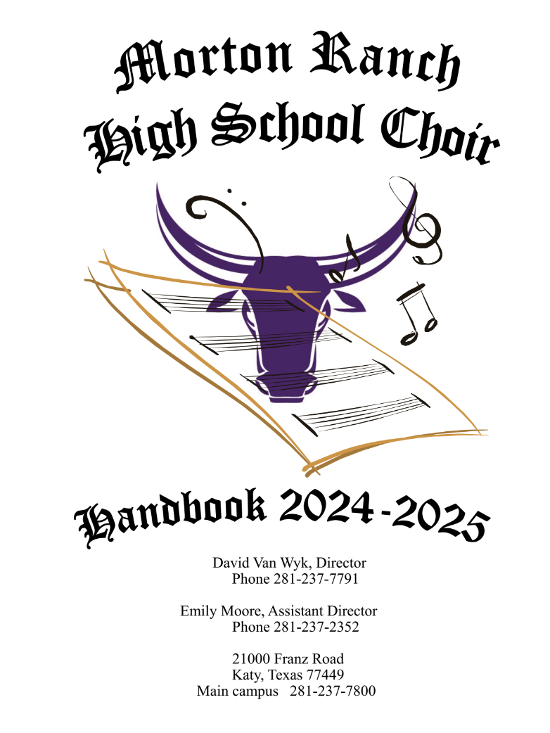 Below are links to important forms and infromation. Morton Ranch High School Choir Handbook 2024/25 school year. Link to the Handbook Agreement Link to our Travel/Medical form Link to our Choir Activity Cost Link to our Pay Nā Go Choir Cost